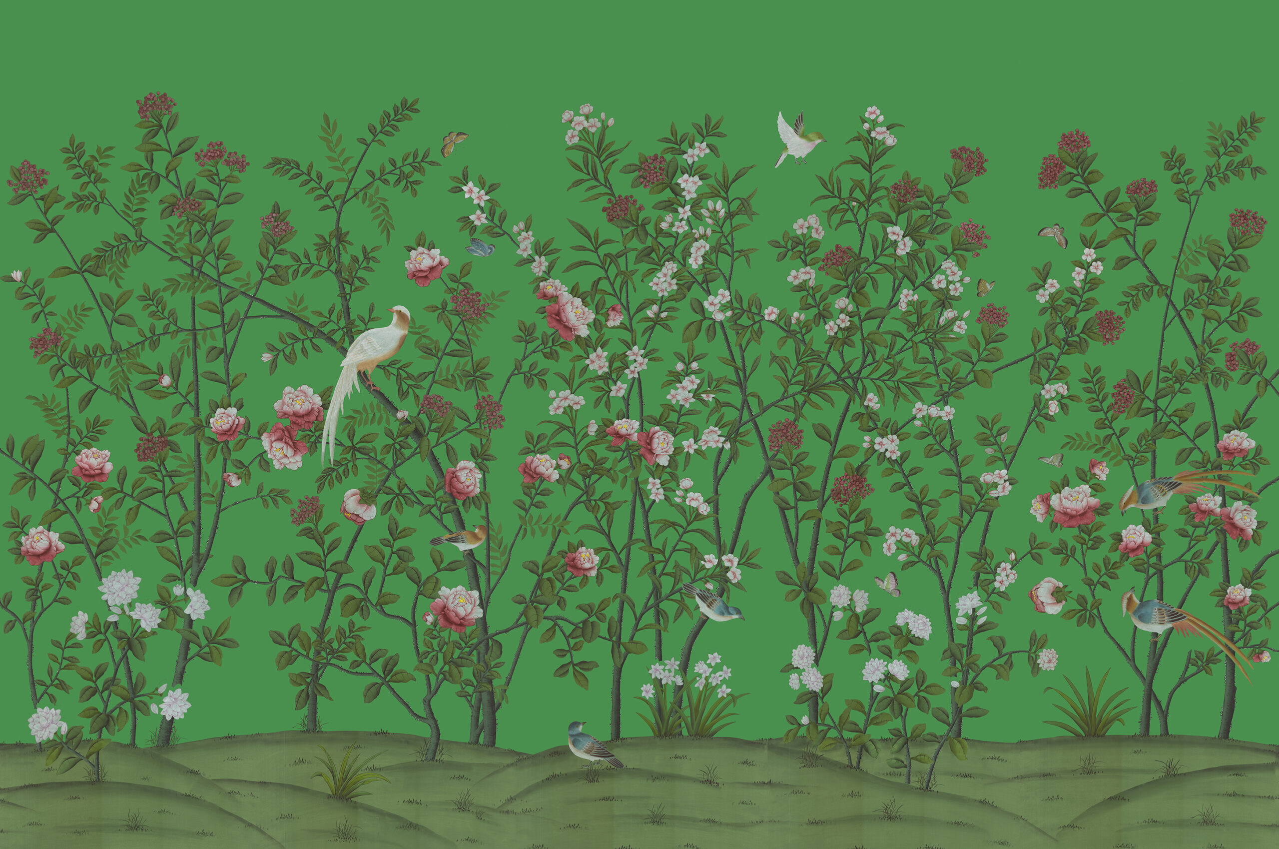 The dense foliage in this design allows it to work especially well in both bright and strong colours as well as natural tones. The flowers and birds provide a colourful vibrant highlight to the foliage. This bold pattern will enhance a room and create a statement in any colours.