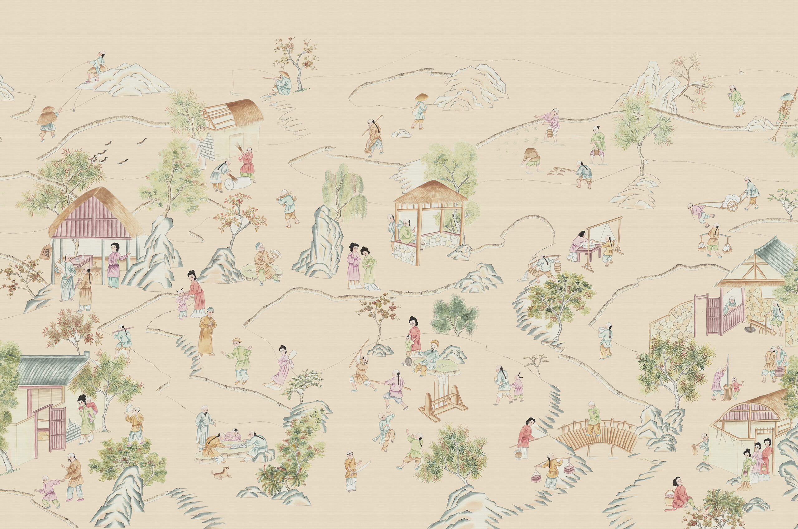 A charming and considered landscape depicting activities of everyday life in a slightly satirical manner popular in decorative arts. Animals, buildings and people are set in a gentle undulating landscape, reminiscent of ancient scholar’s hand painted scrolls. The design is beautiful in both full colour and monochromatic schemes.