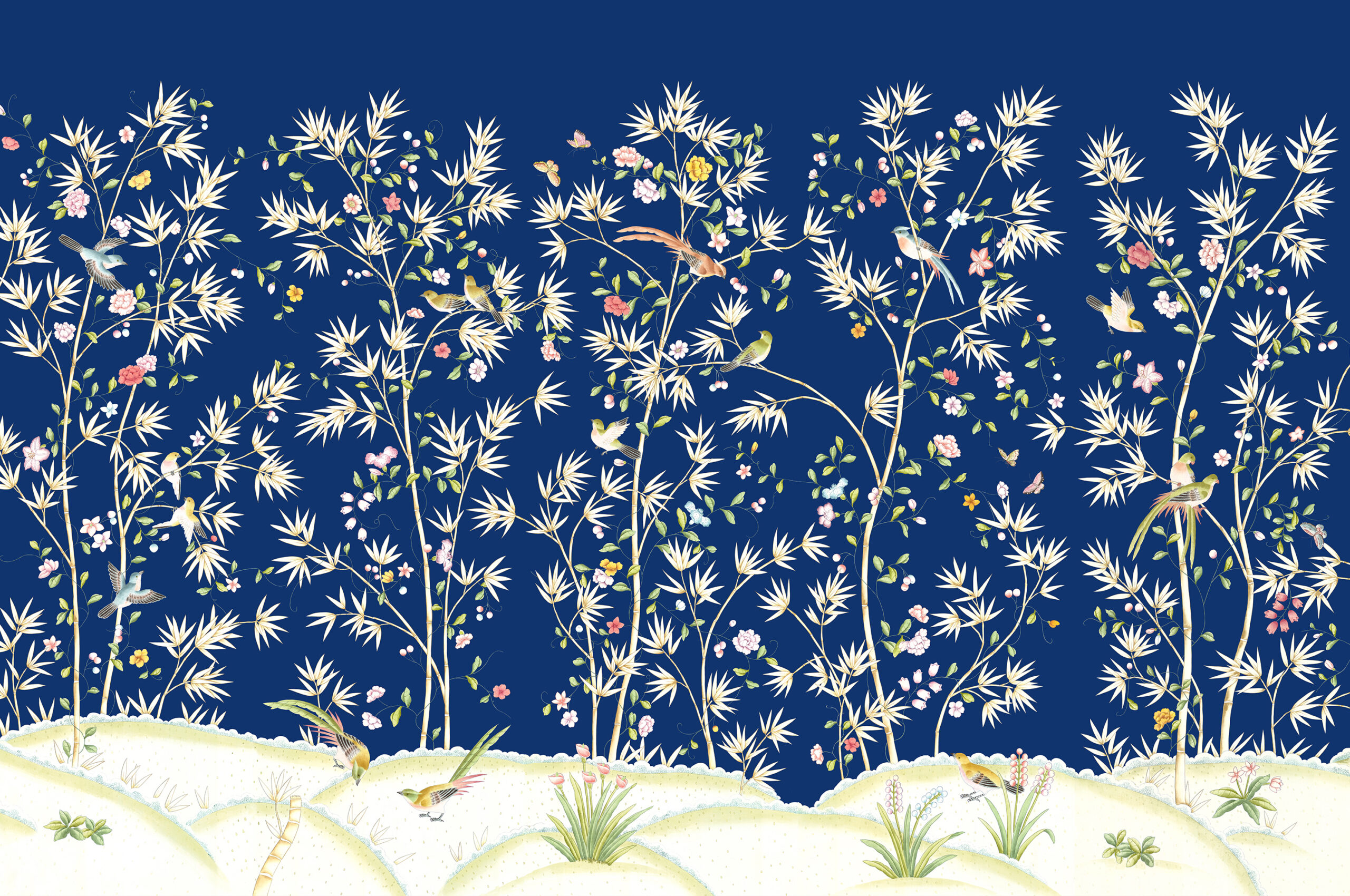 A sophisticated delicate portrayal of a garden drawn with great artistic skill and attention to detail. The bamboo is a symbol of oriental beauty, and a favourite subject of Chinese painters of past dynasties. It stands elegantly throughout the garden supporting exquisitely painted detailed birds and butterflies. This gentle scene works well in a soft or natural colour palette with a light or dark background.