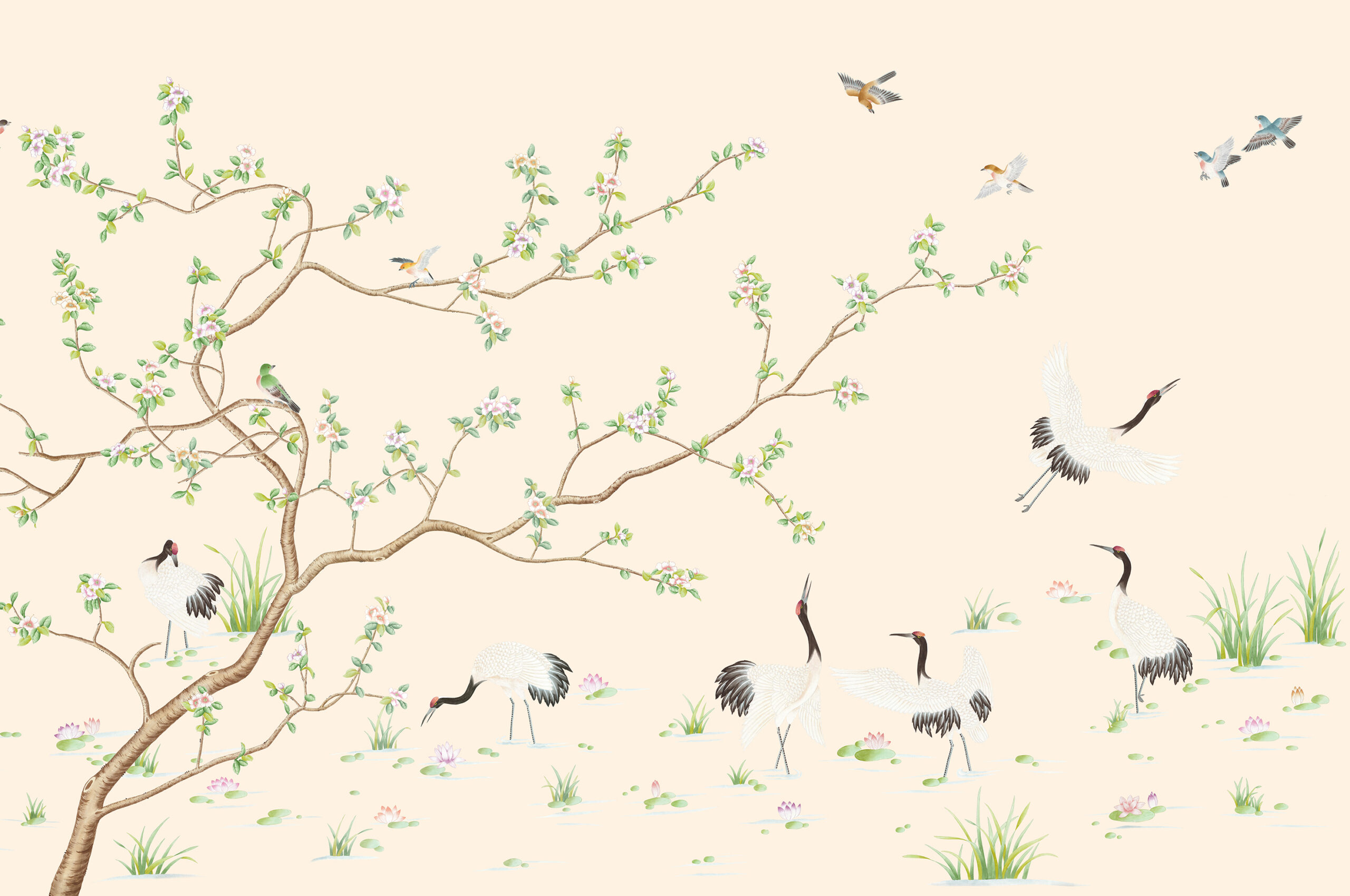 A graceful design depicting a rambling cherry blossom tree surrounded by cranes, the princes of all feathered creatures, including the beautiful Chinese red crowned crane standing tall parading its’ elegant features and royal looking plumage. Other birds land upon branches and flutter around playfully at the top of this glorious scene.