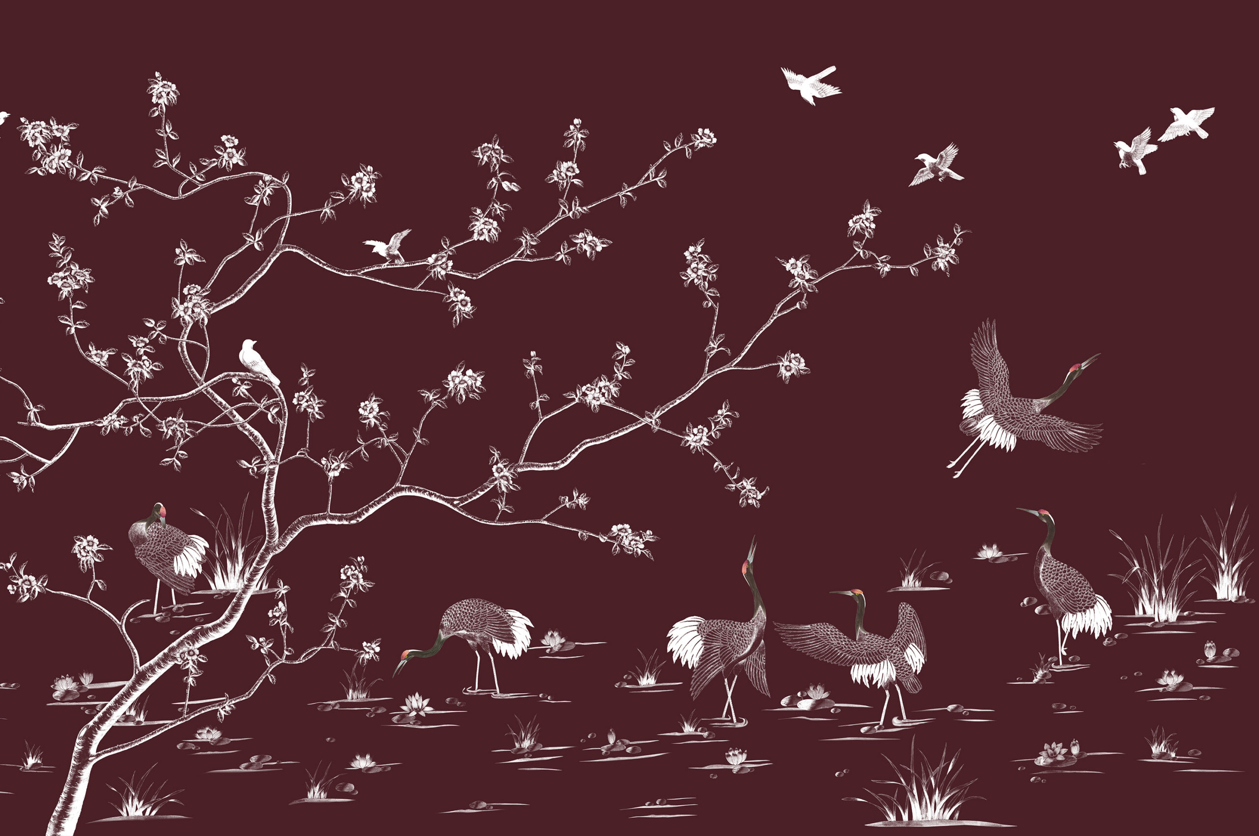 A graceful design depicting a rambling cherry blossom tree surrounded by cranes, the princes of all feathered creatures, including the beautiful Chinese red crowned crane standing tall parading its’ elegant features and royal looking plumage. Other birds land upon branches and flutter around playfully at the top of this glorious scene.