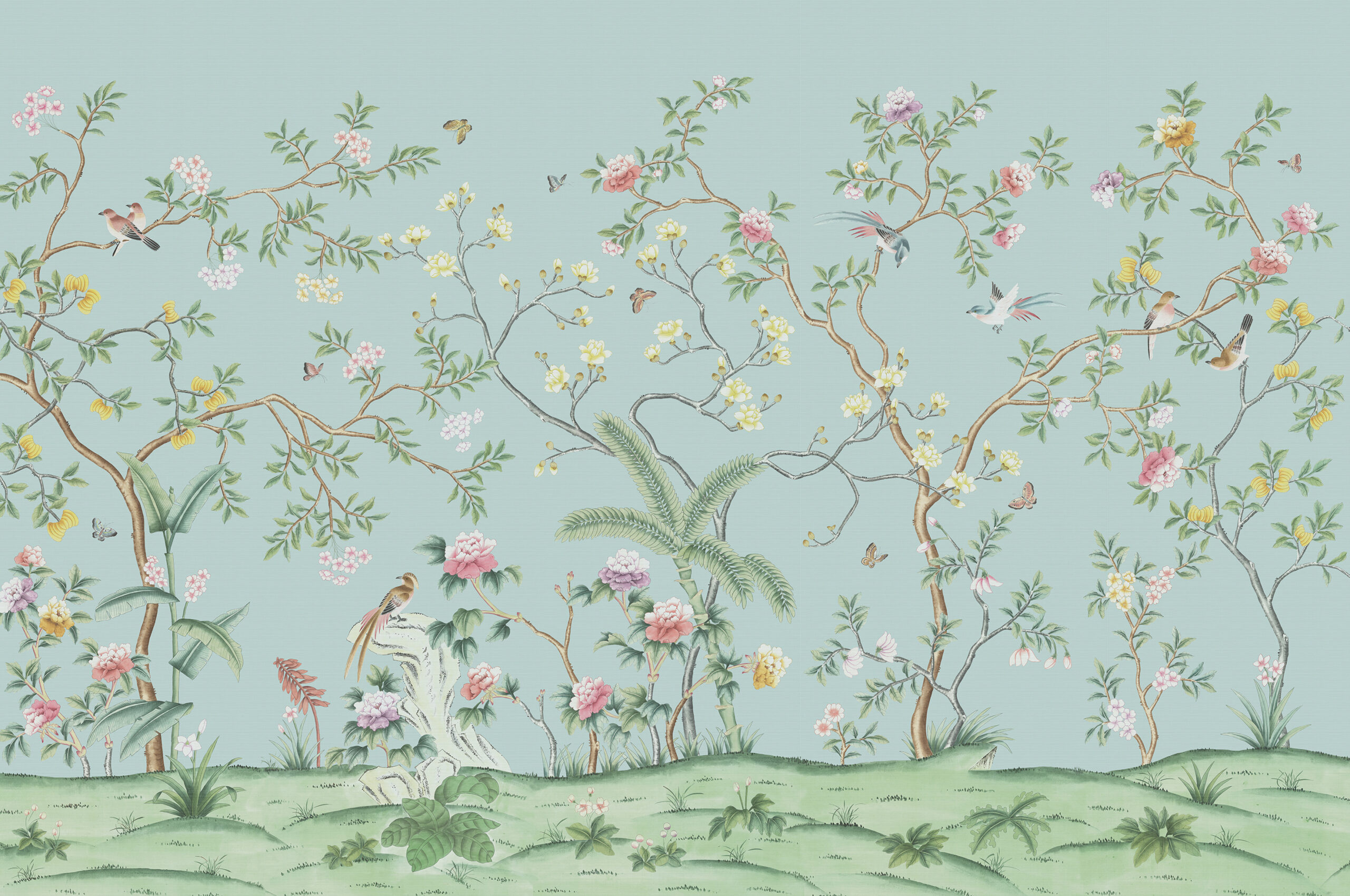 Stunning chinoiserie scene of rich flora and fauna, including bulbous Japanese fern trees contrasting with delicate ornamental trees. This garden in the Kashiki valley features the earliest known flowering plant, the magnolia, alongside majestic long-tailed birds and a delicate array of butterflies.