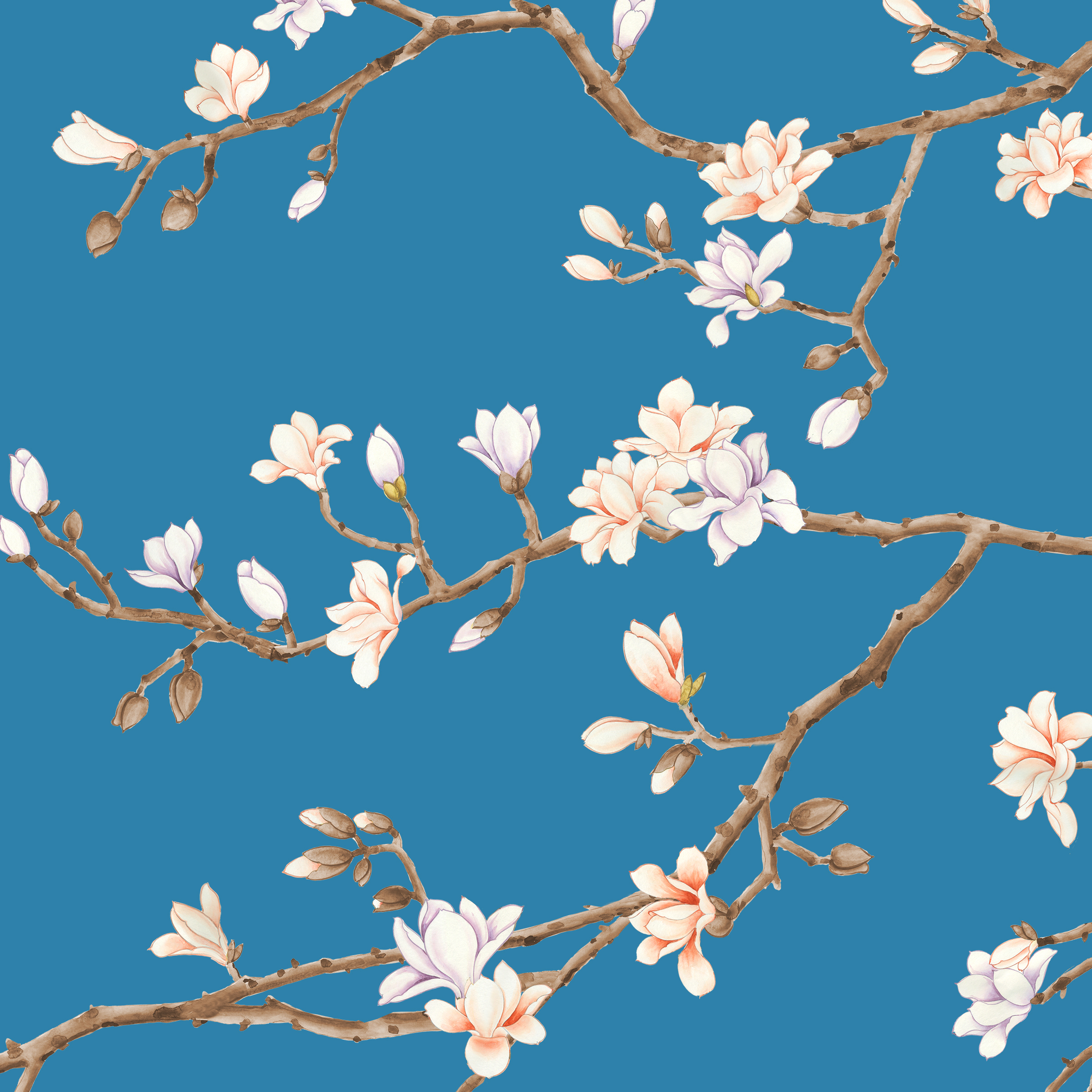 The magnolia tree is symbolic of purity and nobility in Chinese culture, and was known for its healing powers in Traditional Chinese Medicine. Our scenic wallpaper depicts magnolia trees in bloom with petals of multiple shades falling gently between the branches of the two trees.