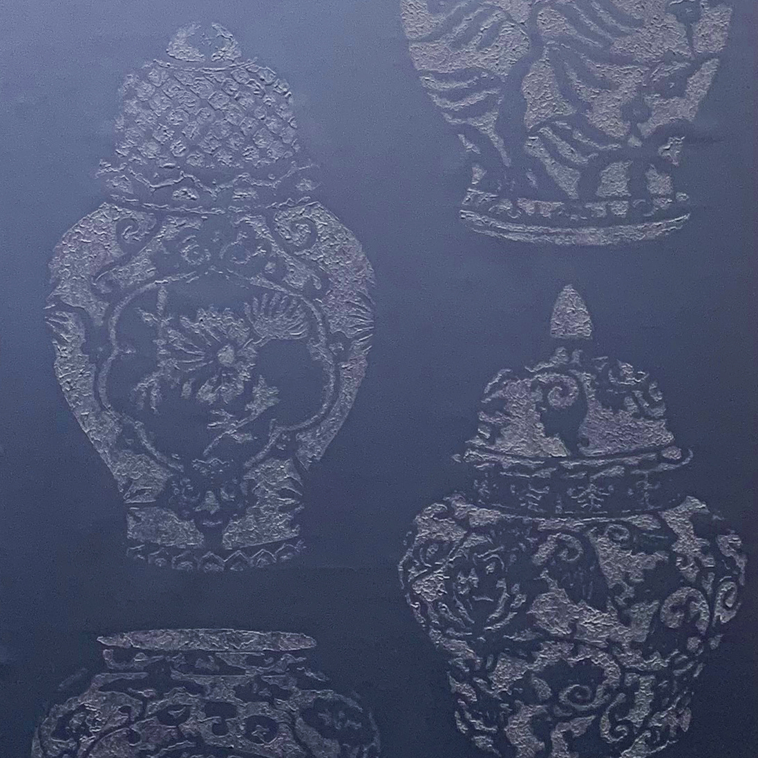 Design Mandarin features striking large scale ginger jars and oriental pots sculpted onto hand gilded pearlised metallic or grasscloth. On our hand gilded pearlised metallic the densely textured pots stand o the lightly textured metallic ground. The image is powerful featuring a variety of oriental pots and vases in different shapes and sizes. On grasscloth the metallic pearlised pots stand proud of the matt grasscloth ground creating a dynamic three dimensional wall covering.