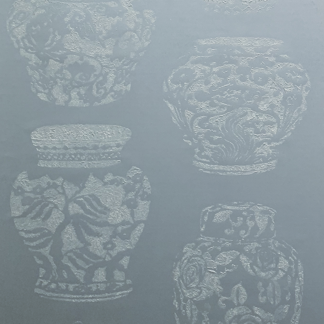 Design Mandarin features striking large scale ginger jars and oriental pots sculpted onto hand gilded pearlised metallic or grasscloth. On our hand gilded pearlised metallic the densely textured pots stand o the lightly textured metallic ground. The image is powerful featuring a variety of oriental pots and vases in different shapes and sizes. On grasscloth the metallic pearlised pots stand proud of the matt grasscloth ground creating a dynamic three dimensional wall covering.