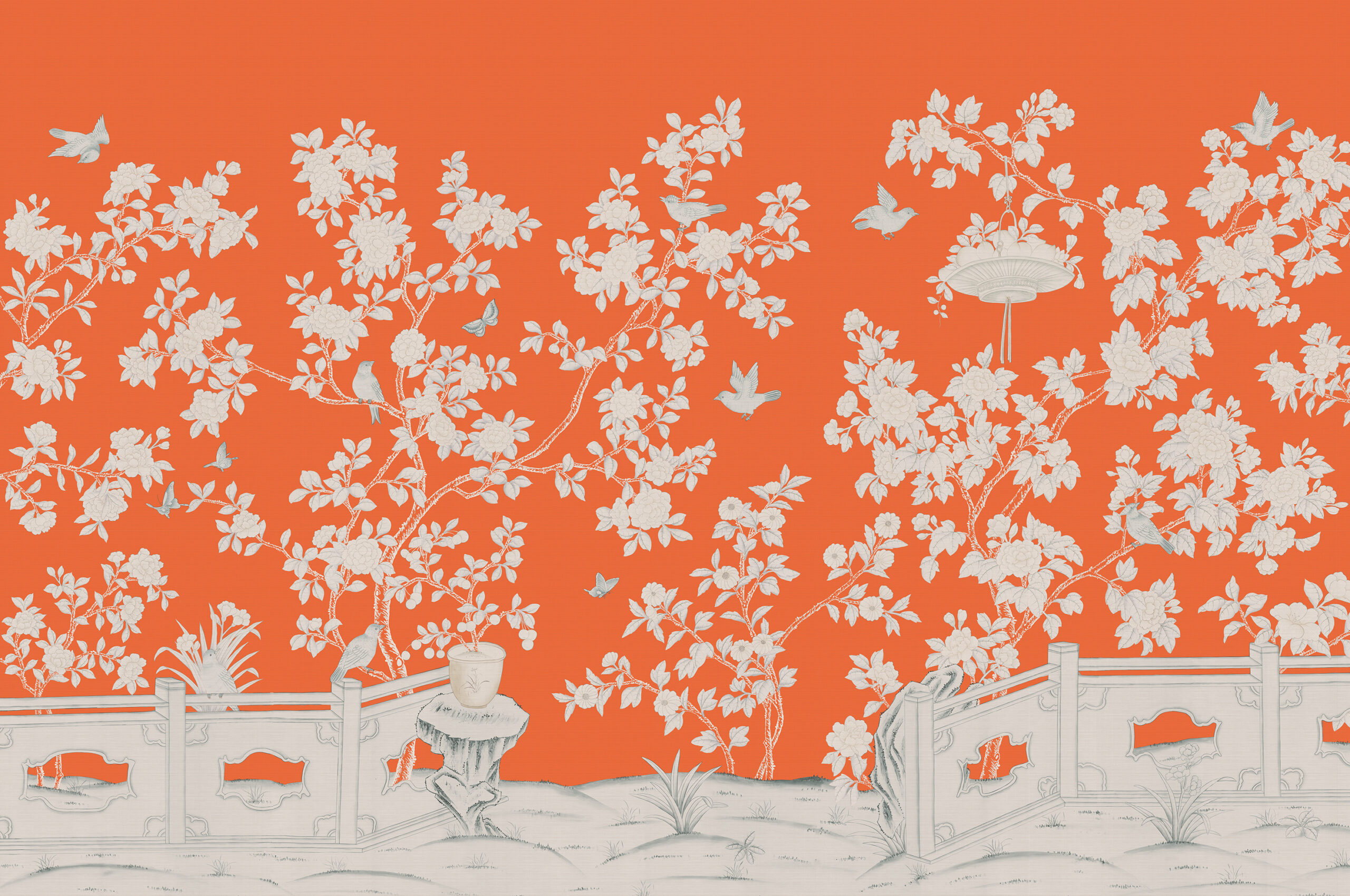 A lively garden scene in the traditional style, reminiscent of the famous gardens of Suzhou. Birds and butterflies enjoy the fruits left for them. This beautiful scene transports the viewer back to a golden age of Chinese formal gardens. Print on natural grass cloth or arrowroot to create ageless depth, or gilded metallic or paper for a crisper formal look.
