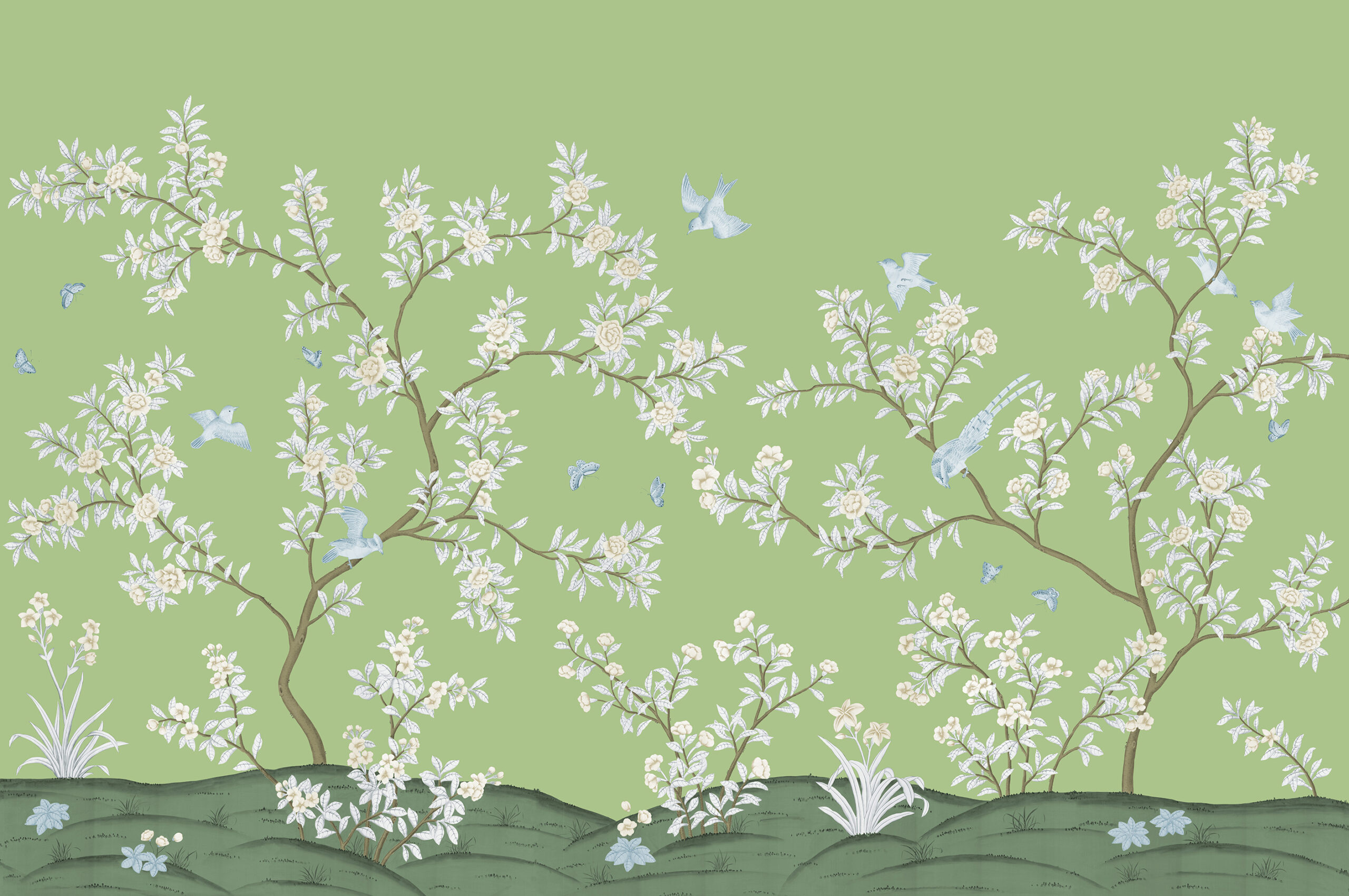 This scene near the ancient city of Lijiang Old Town features a passageway with grape vines hanging above. It was a favourite pastime to walk under such vines in the quiet shade of a humble garden. The hanging vines are softly highlighted with flowers, butterflies and birds. A room decorated with this pattern provides a very unique look.