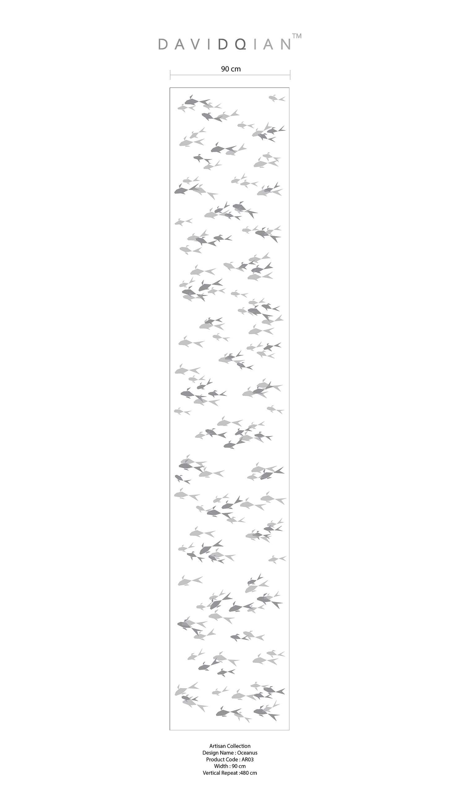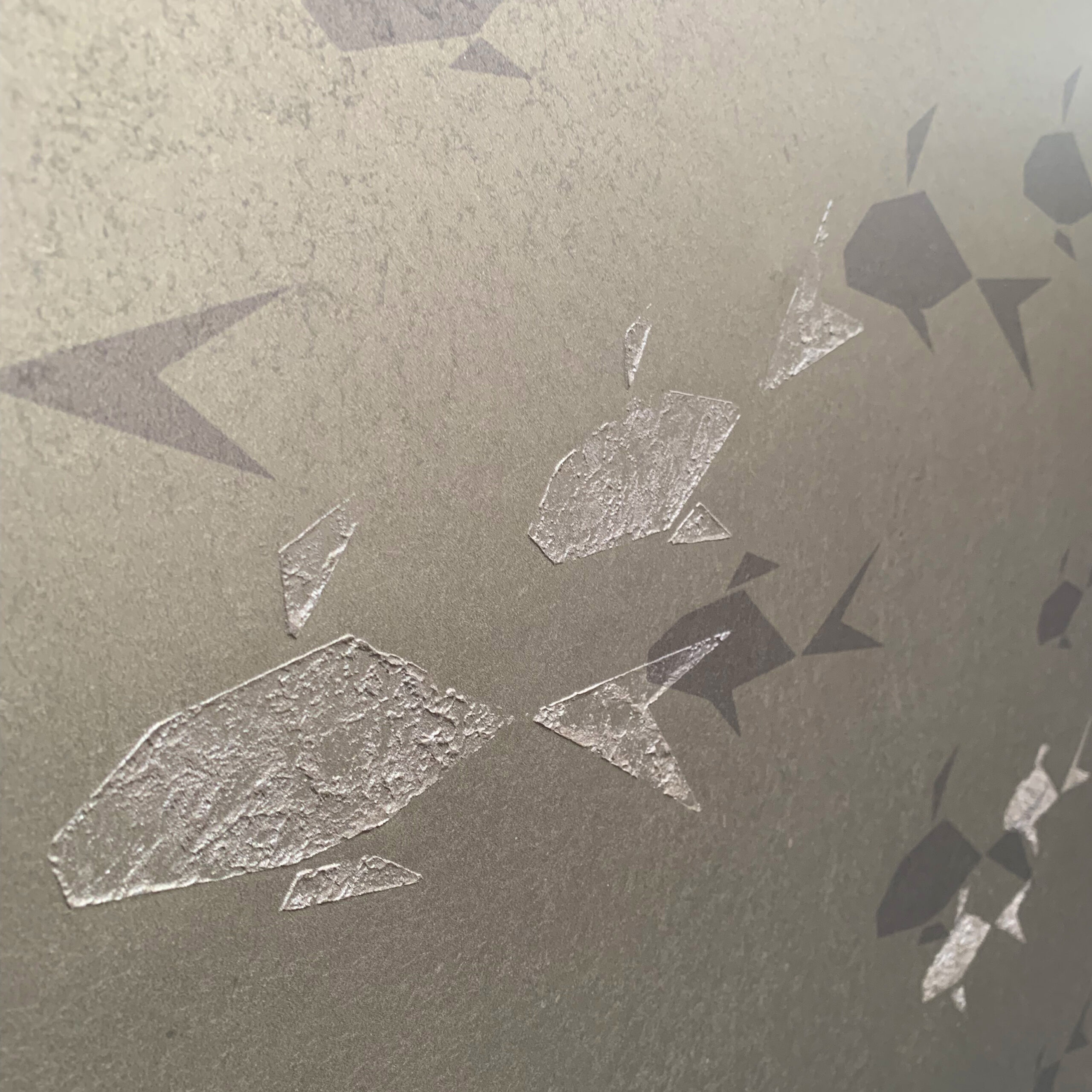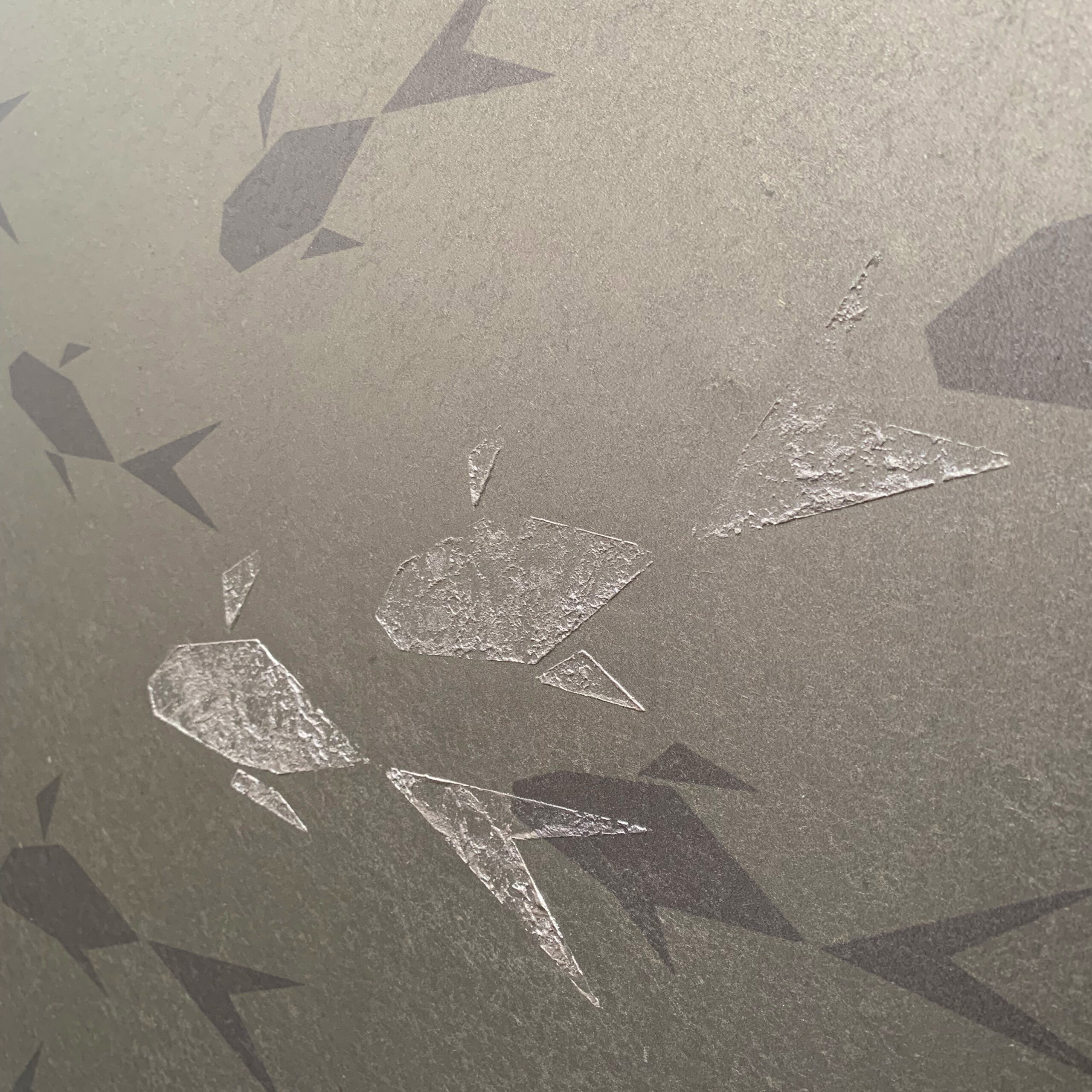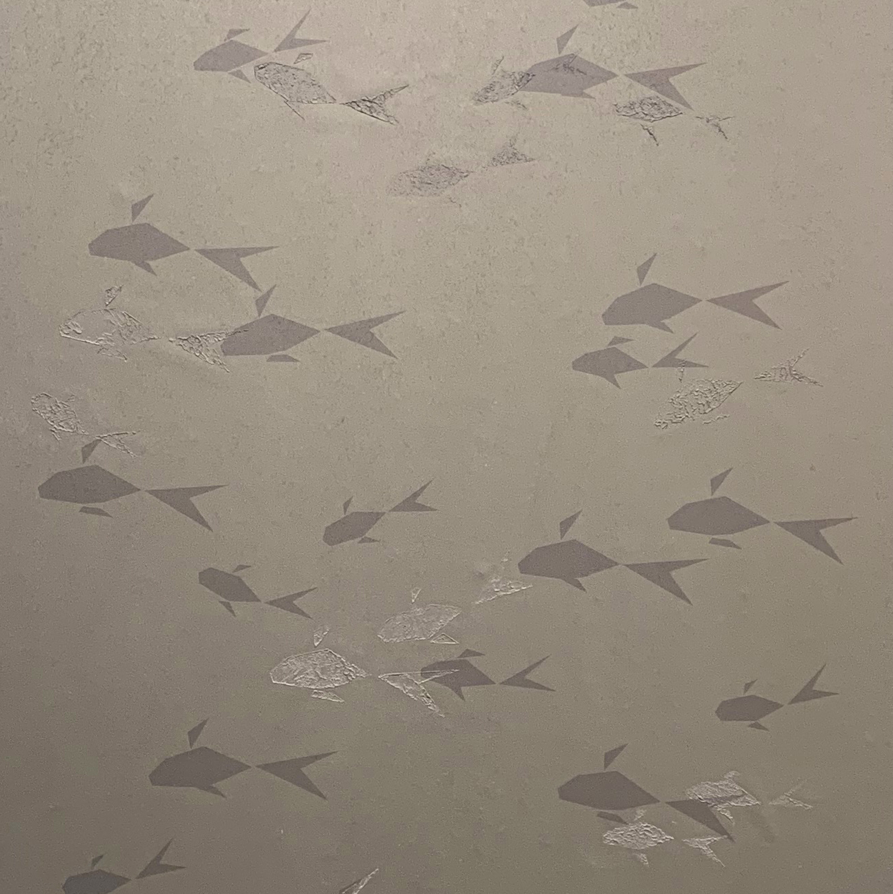 Design Oceanus illustrates free swimming fish on a textured pearlised hand gilded metallic surface. The fish move together in one direction their different shades emphasising the three dimensional quality of the design. This complex pattern and structure uniquely provides an overall tranquil calm scene that appears simple and contemporary. This wall covering will charm both modern and traditional settings.