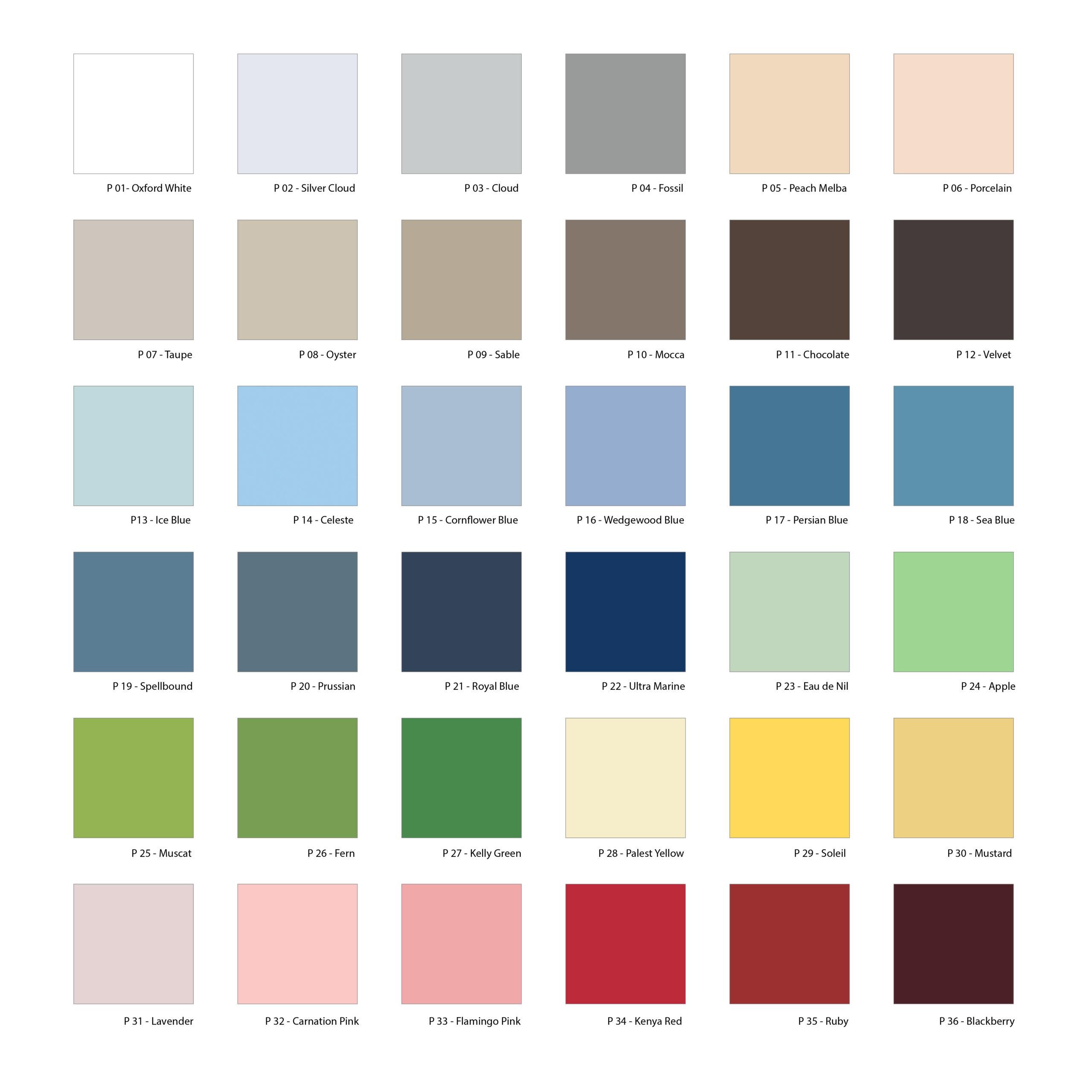 | COLOUR | N/A, P01 Oxford White, P02 Silver Cloud, P03 Cloud, P04 Fossil, P05 Peach Melba, P06 Porcelain, P07 Taupe, P08 Oyster, P09 Sable, P10 Mocca, P11 Chocolate, P12 Velvet, P13 Ice Blue, P14 Hyacinth Blue, P15 Cornflower Blue, P16 Wedgewood Blue, P17 Persian Blue, P18 Sea Blue, P19 Spellbound, P20 Prussian, P21 Royal Blue, P22 Ultra Marine, P23 Eau de Nil, P24 Apple, P25 Muscat, P26 Fern, P27 Kelly Green, P28 Palest Yellow, P29 Soleil, P30 Mustard, P31 Lavender, P32 Carnation Pink, P33 Flamingo Pink, P34 Kenya Red, P35 Ruby, P36 Blackberry |