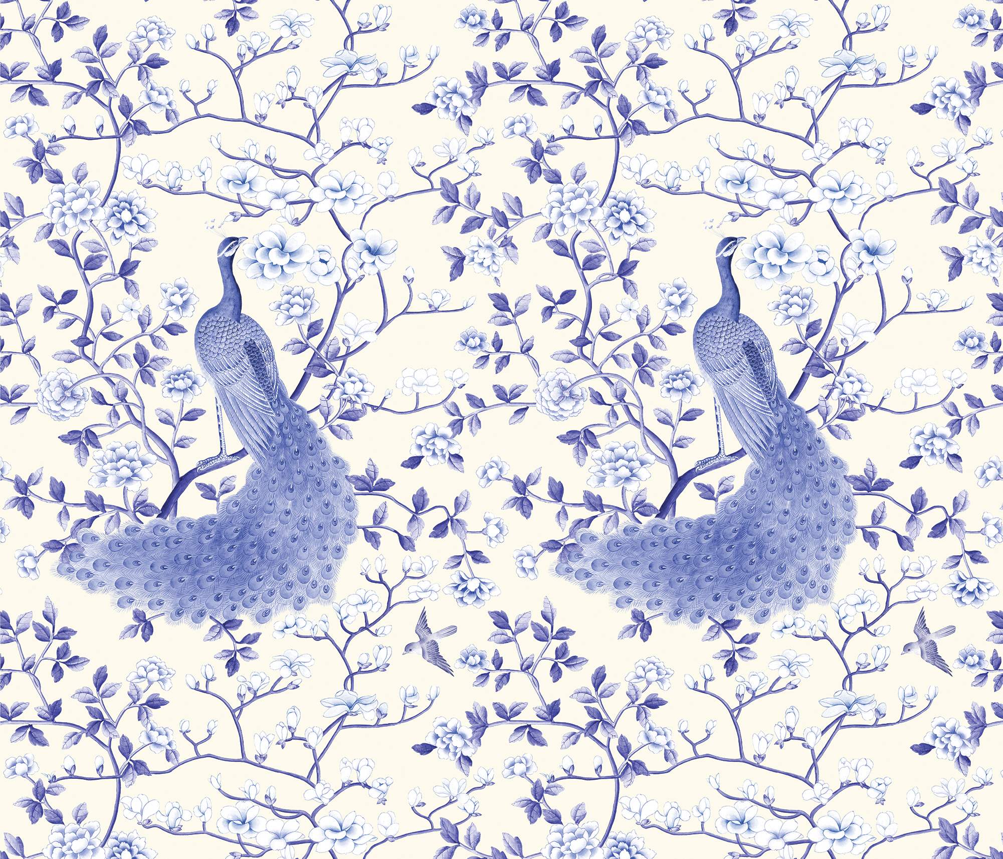A stunning representation of the splendid peacock symbolising dignity and beauty. This bird was a symbol of the Ming dynasty, with its tail of 100 eyes it is also associated with the goddess Guan Yin, and here represents protection and kindness. The design is beautiful as a wall covering and also creates a unique statement as a mural.