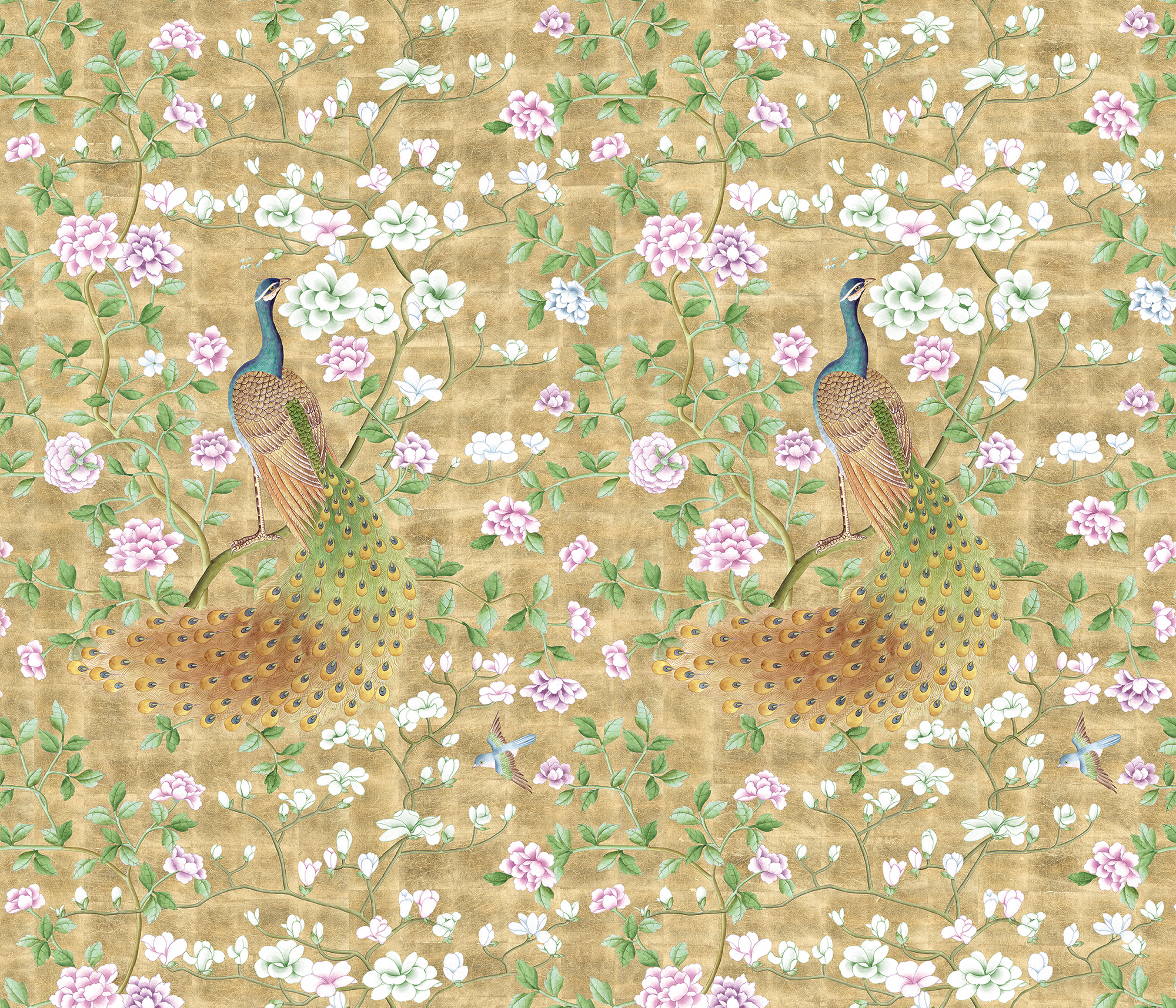 A stunning representation of the splendid peacock symbolising dignity and beauty. This bird was a symbol of the Ming dynasty, with its tail of 100 eyes it is also associated with the goddess Guan Yin, and here represents protection and kindness. The design is beautiful as a wall covering and also creates a unique statement as a mural.