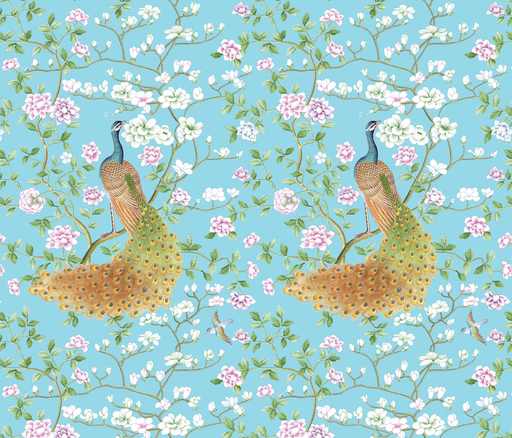 A stunning representation of the splendid peacock symbolising dignity and beauty. This bird was a symbol of the Ming dynasty, with its tail of 100 eyes it is also associated with the goddess Guan Yin, and here represents protection and kindness. The design is beautiful as a wall covering and also creates a unique statement as a mural.