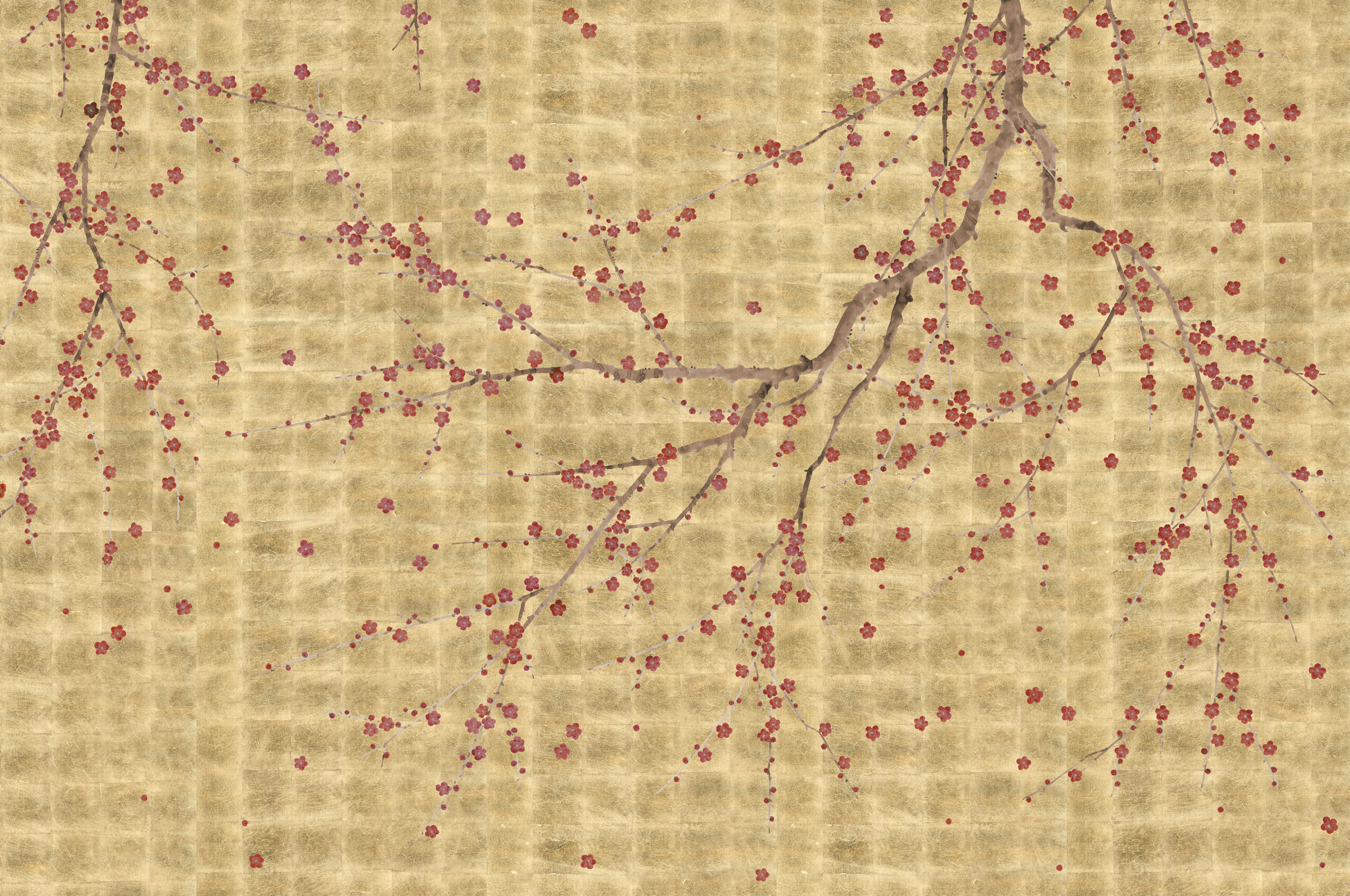 Prunus Mume, Chinese Plum or Japanese Plum is an East Asian tree species. The plum blossom is a long beloved subject in the traditional painting and poetry of East Asia. The design features exquisitely painted plum blossom on delicate trailing branches and carefully scattered around the scene. Perfect in both traditional and contemporary colours and settings.