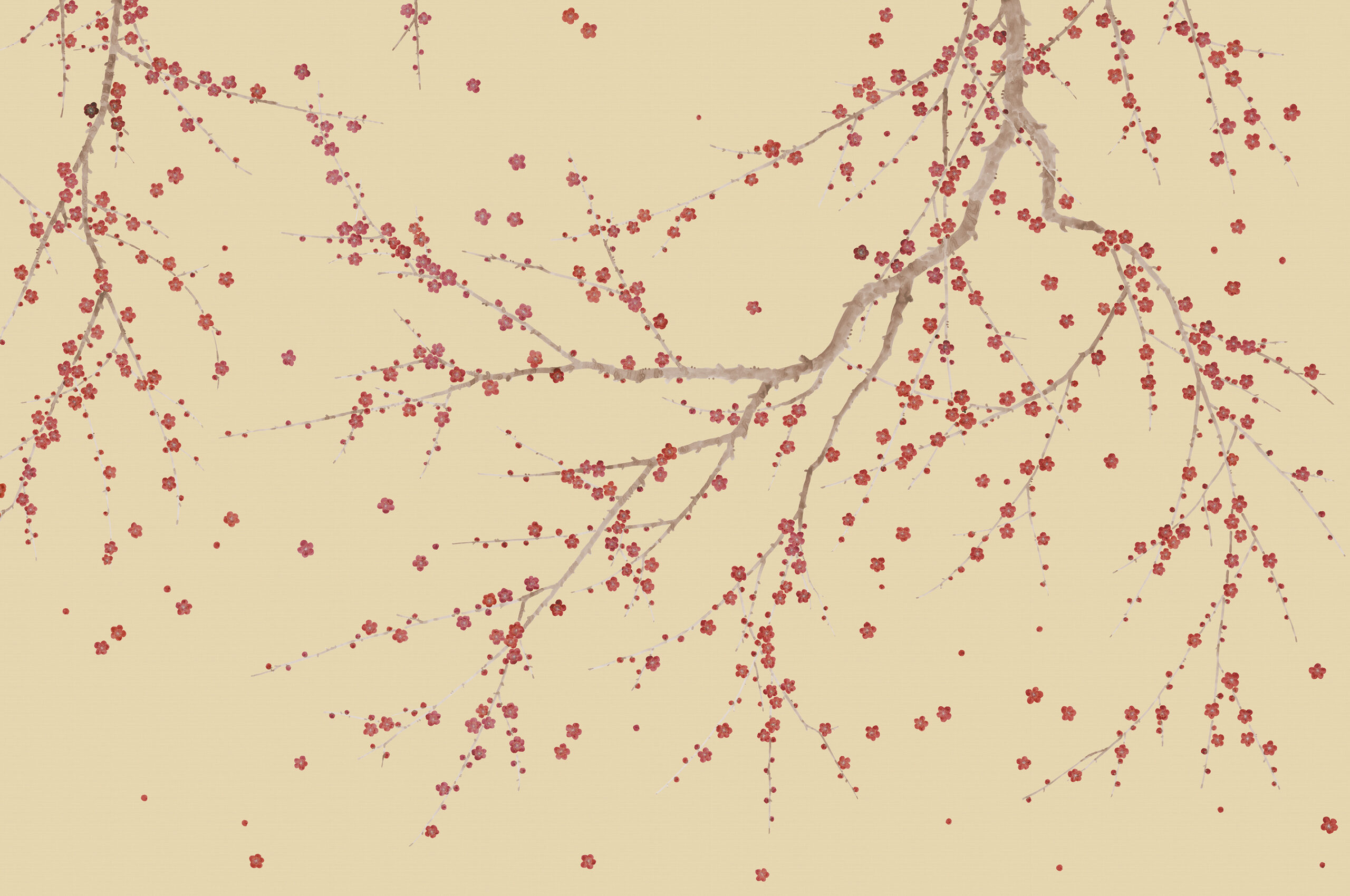 Prunus Mume, Chinese Plum or Japanese Plum is an East Asian tree species. The plum blossom is a long beloved subject in the traditional painting and poetry of East Asia. The design features exquisitely painted plum blossom on delicate trailing branches and carefully scattered around the scene. Perfect in both traditional and contemporary colours and settings.