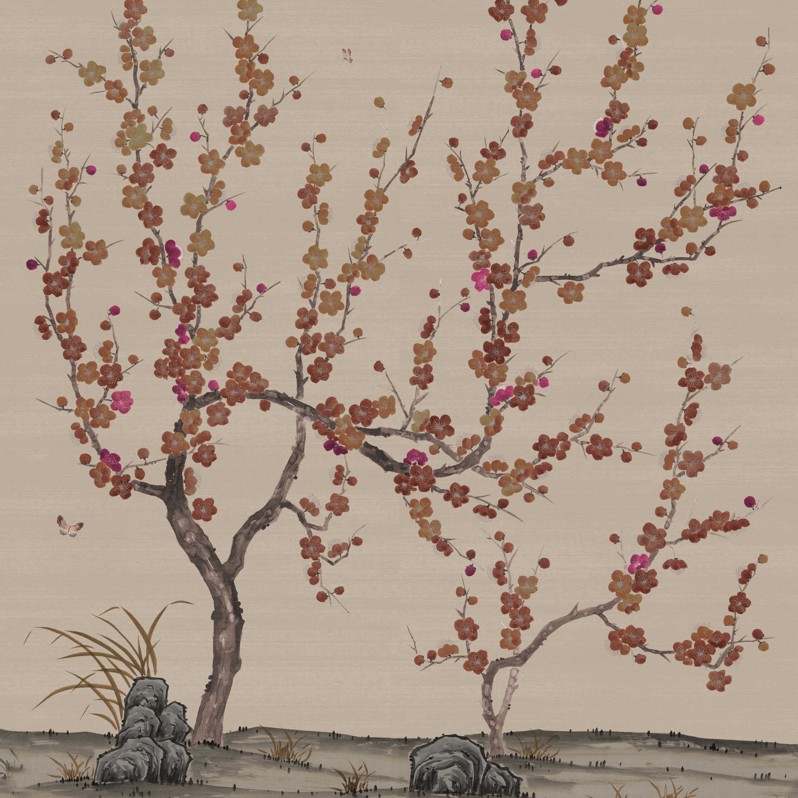 Chinese or Japanese plum blossom is a long beloved subject in the traditional painting and poetry of East Asia. Our Plum design features exquisitely hand painted plum trees with butterflies fluttering silently from blossom to blossom.