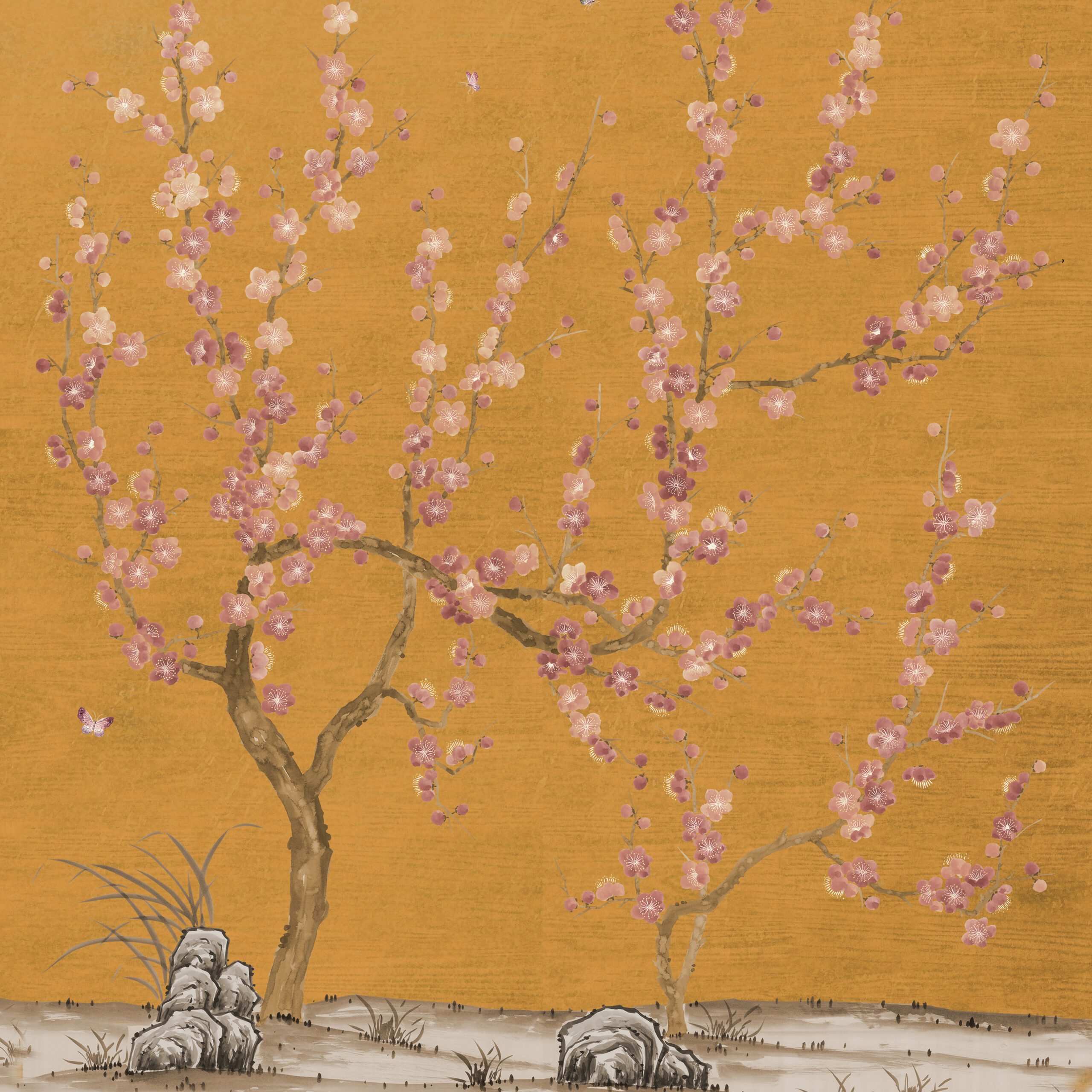 Chinese or Japanese plum blossom is a long beloved subject in the traditional painting and poetry of East Asia. Our Plum design features exquisitely hand painted plum trees with butterflies fluttering silently from blossom to blossom.
