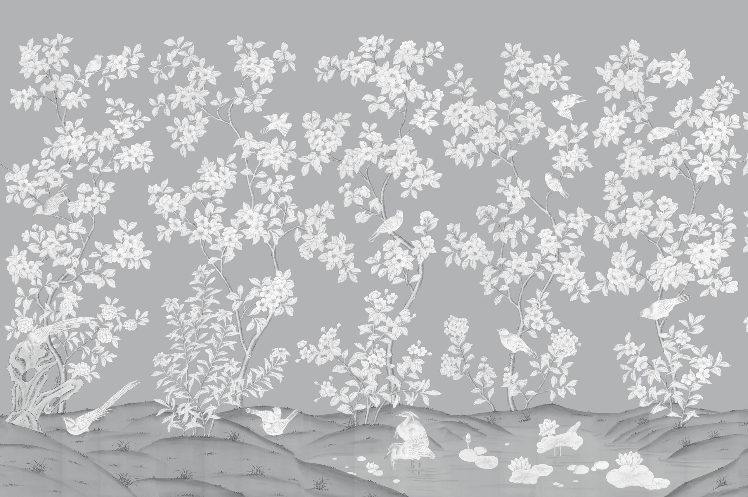 A classical scene of a fruit orchard depicting flowering crab apples and a variety of birds including a pair of traditional long tailed pheasants which were popular motifs in the decorative art of chinoiserie. On natural grounds such as grass cloth or arrowroot or sanded paper these designs compare favourably to the hand painted originals.