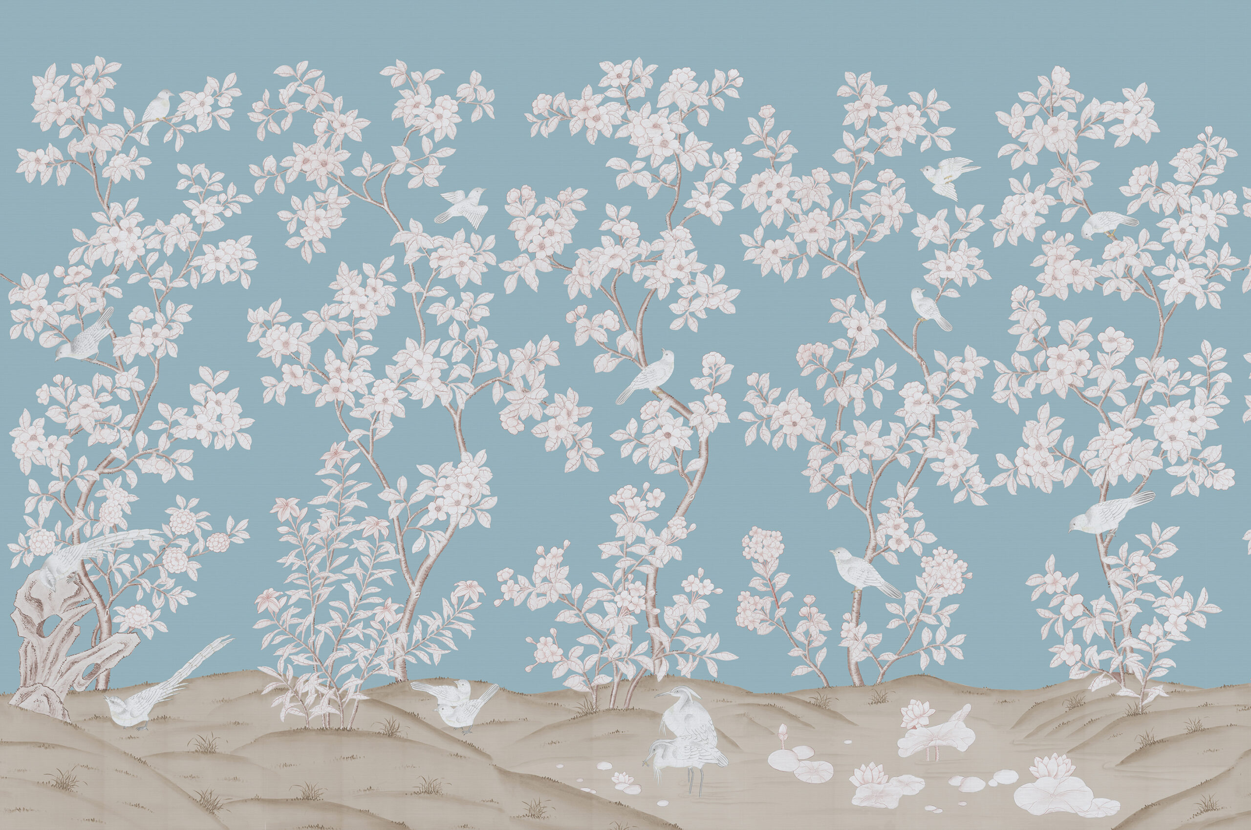 A classical scene of a fruit orchard depicting flowering crab apples and a variety of birds including a pair of traditional long tailed pheasants which were popular motifs in the decorative art of chinoiserie. On natural grounds such as grass cloth or arrowroot or sanded paper these designs compare favourably to the hand painted originals.