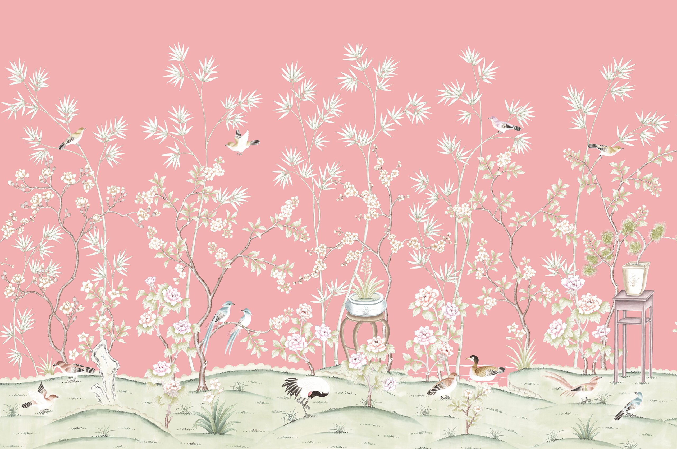 A beautiful and delicate chinoiserie scene depicting ancient Chinese vases upon elegant stands. Mandarin ducks and wild birds live blissfully amongst carefully positioned trees and a backdrop of delicate bamboo, representing happiness and patience.