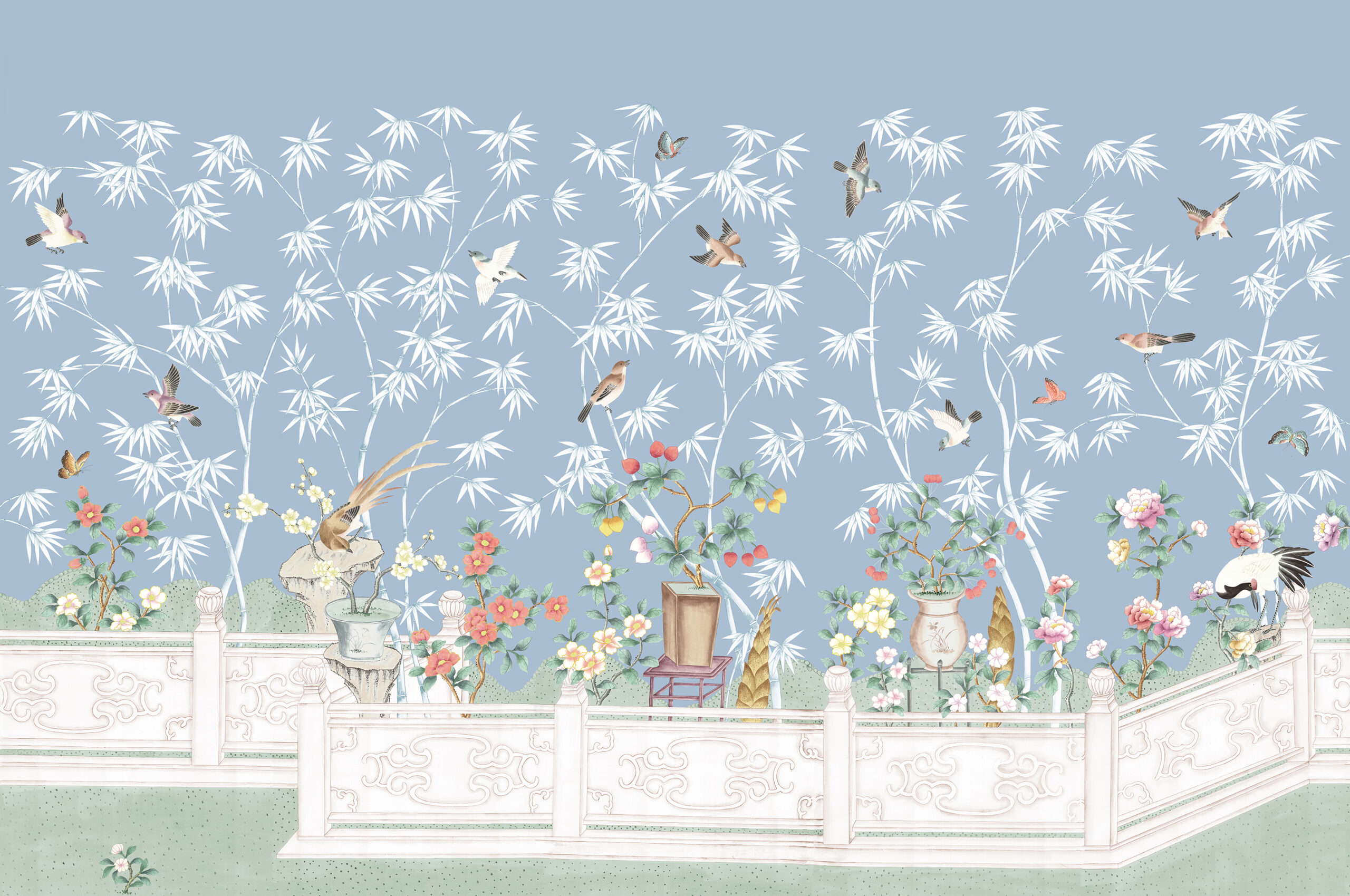 An elegant representation of a Chinese garden with meandering path. This delicate scene in Jiang Nan features the Chinese red crowned crane embodying longevity, peace & happiness in ancient tradition. The elaborate garden features decorative artifacts of the period with birds & butterflies set against a backdrop of delicate bamboo.