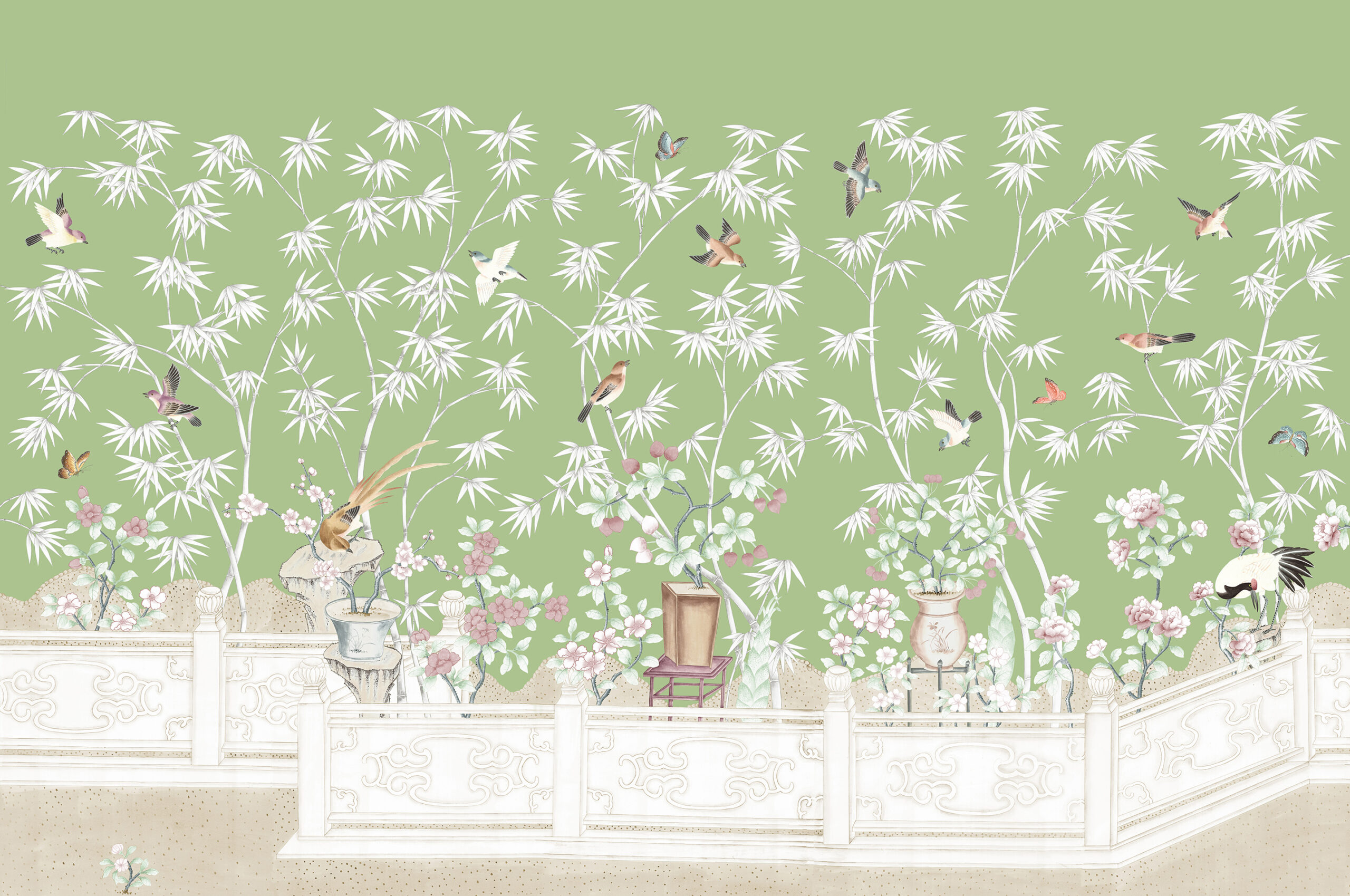 An elegant representation of a Chinese garden with meandering path. This delicate scene in Jiang Nan features the Chinese red crowned crane embodying longevity, peace & happiness in ancient tradition. The elaborate garden features decorative artifacts of the period with birds & butterflies set against a backdrop of delicate bamboo.