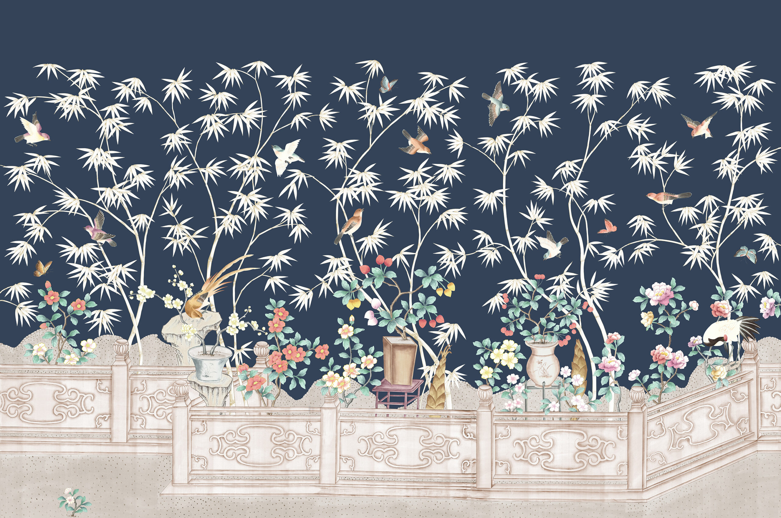 An elegant representation of a Chinese garden with meandering path. This delicate scene in Jiang Nan features the Chinese red crowned crane embodying longevity, peace & happiness in ancient tradition. The elaborate garden features decorative artifacts of the period with birds & butterflies set against a backdrop of delicate bamboo.