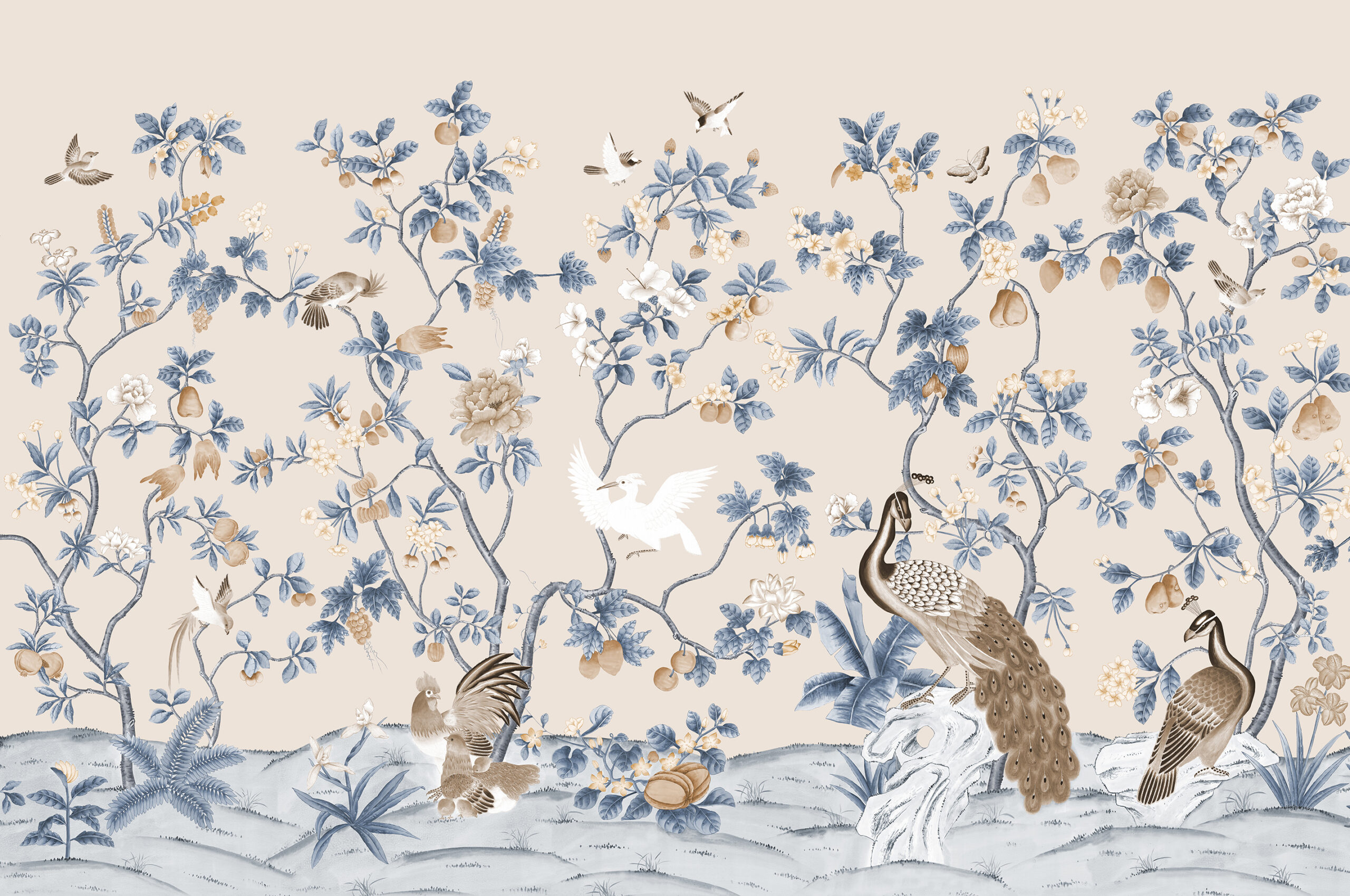 A stunning representation of an elaborate garden in full bloom with hanging fruits and, splendid peacock and peahen both symbols of dignity and beauty. This bird was a symbol of the Ming dynasty, and with its tail of 100 eyes is also associated with the goddess Guan Yin, in this sense representing protection and kindness. The ancient Chinese silkie chicken stands proud in the foreground whilst other exotic birds and butterflies complete the scene.