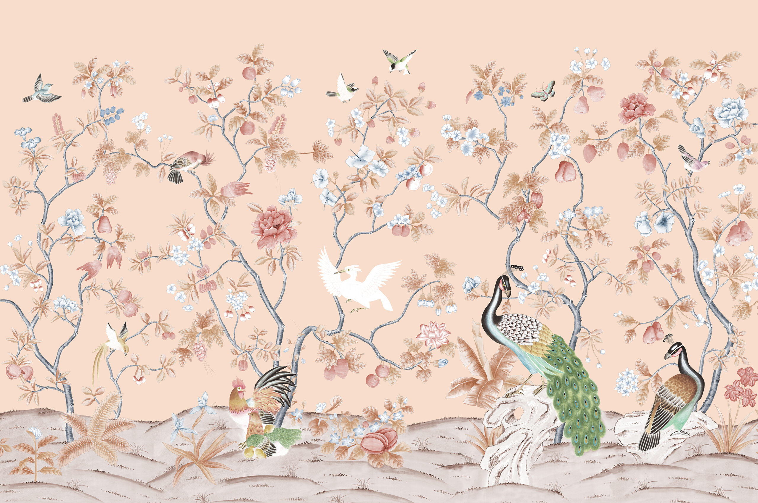 A stunning representation of an elaborate garden in full bloom with hanging fruits and, splendid peacock and peahen both symbols of dignity and beauty. This bird was a symbol of the Ming dynasty, and with its tail of 100 eyes is also associated with the goddess Guan Yin, in this sense representing protection and kindness. The ancient Chinese silkie chicken stands proud in the foreground whilst other exotic birds and butterflies complete the scene.