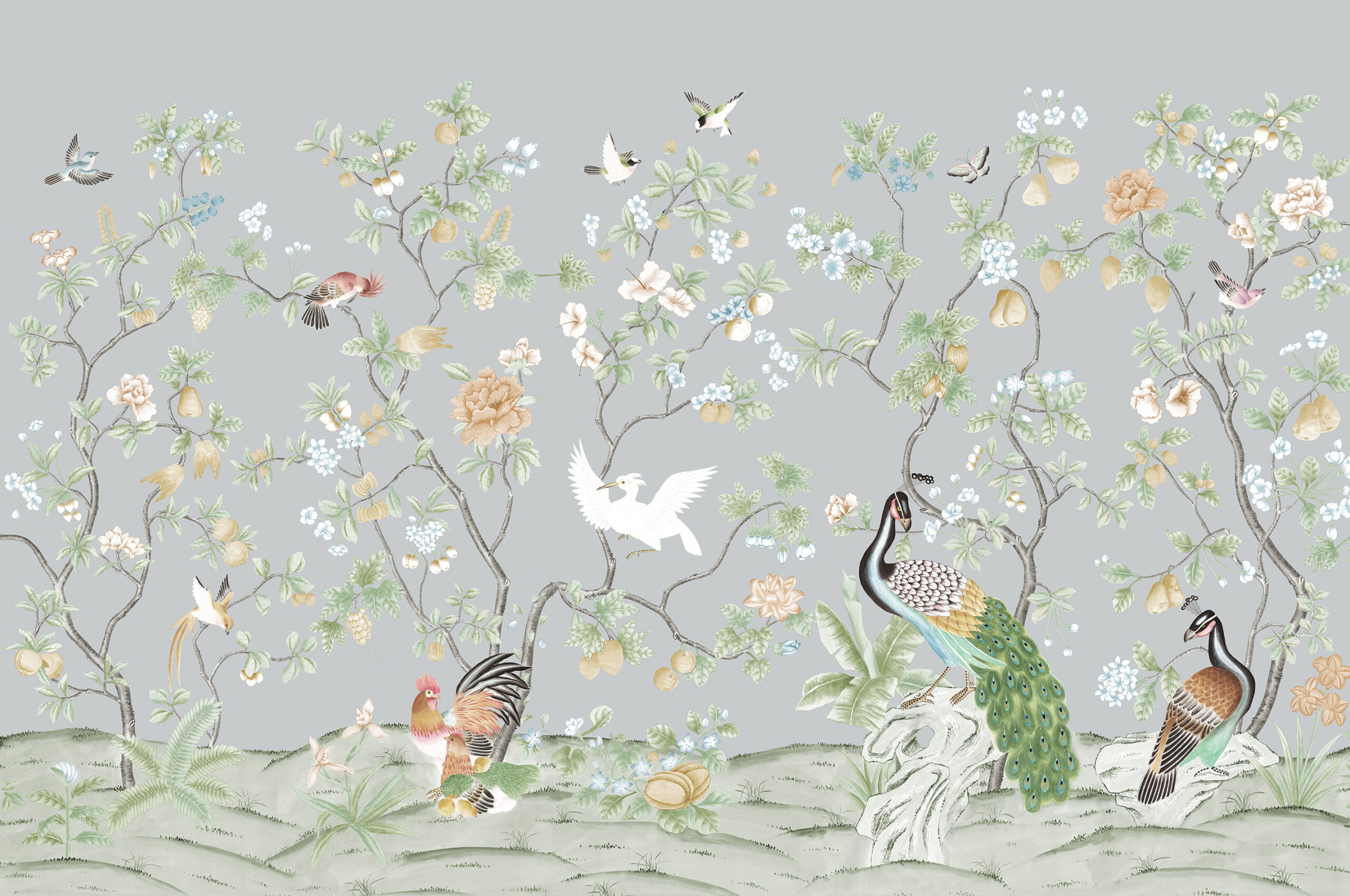 A stunning representation of an elaborate garden in full bloom with hanging fruits and, splendid peacock and peahen both symbols of dignity and beauty. This bird was a symbol of the Ming dynasty, and with its tail of 100 eyes is also associated with the goddess Guan Yin, in this sense representing protection and kindness. The ancient Chinese silkie chicken stands proud in the foreground whilst other exotic birds and butterflies complete the scene.