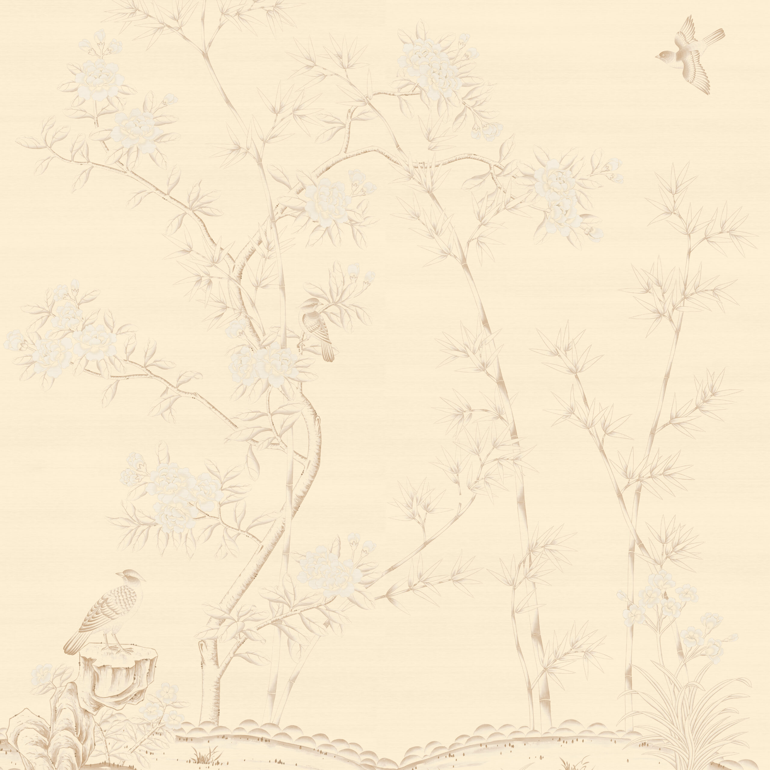 Our contemporary Sangla Garden provides the perfect space around the trees and motifs to create a tranquil, peaceful environment. Birds, flowers and butterflies, popular motifs in the decorative art of chinoiserie, feature throughout this elegantly hand painted scene.