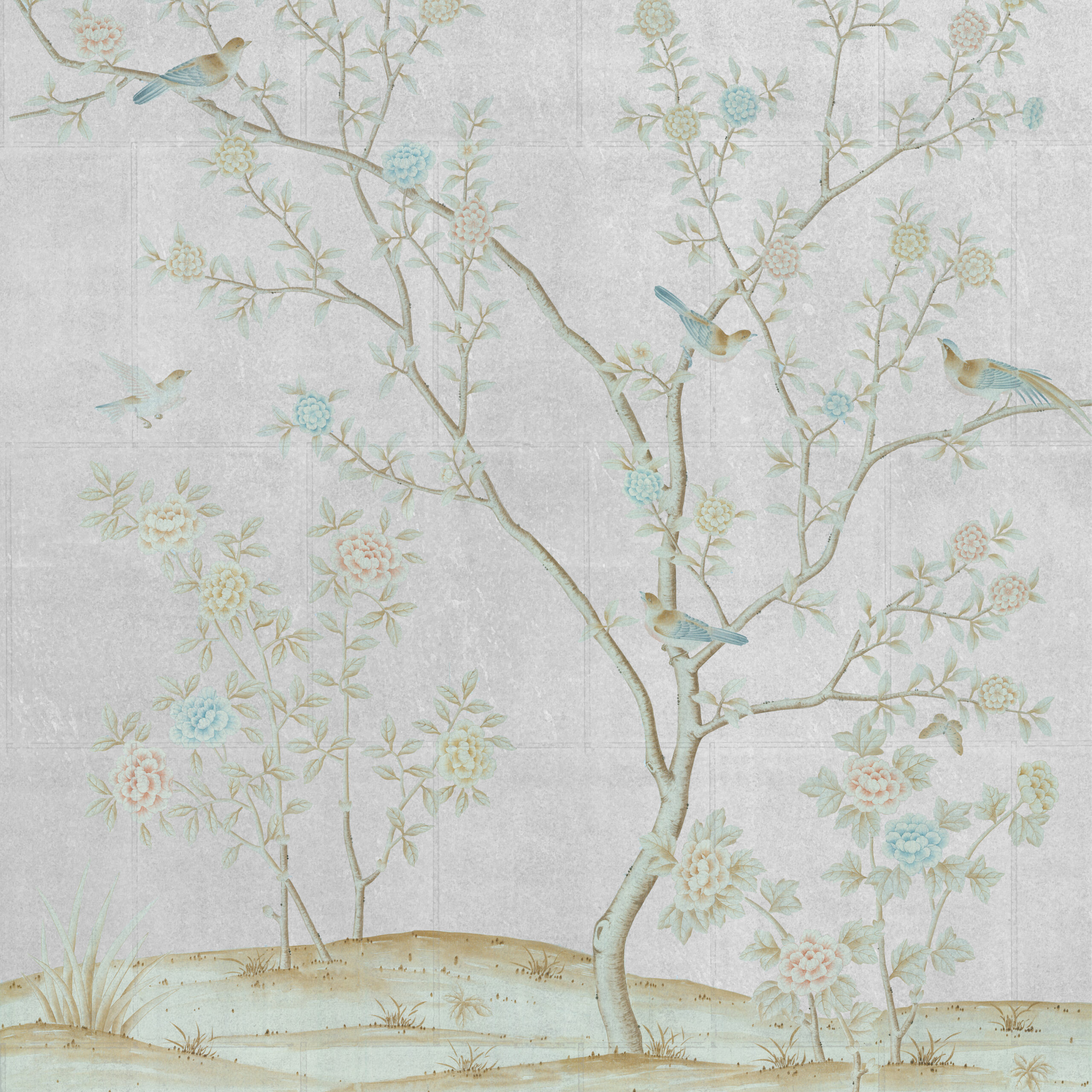 Tags: Chinoiseries, Floral/Botanical, Hand Painted, Mural, Pieced and Glued Metallic, Silver, Traditional